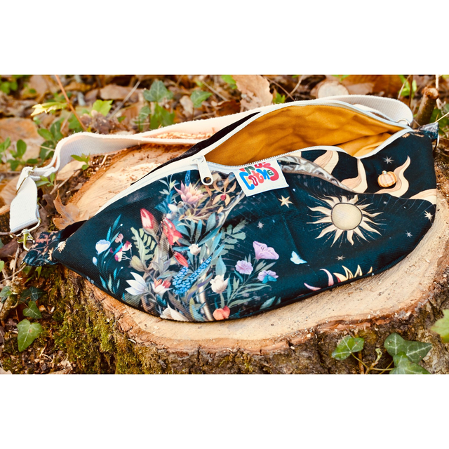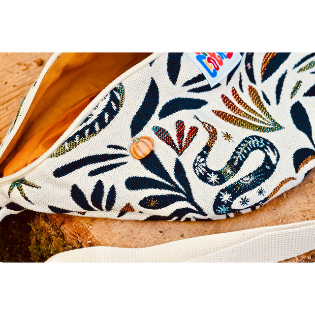 Chaque banane XL est fabriquée à la main avec des tissus revalorisés : l’une issue d’un tissu de seconde main, l’autre créée à partir d’anciens tapis de tarot.